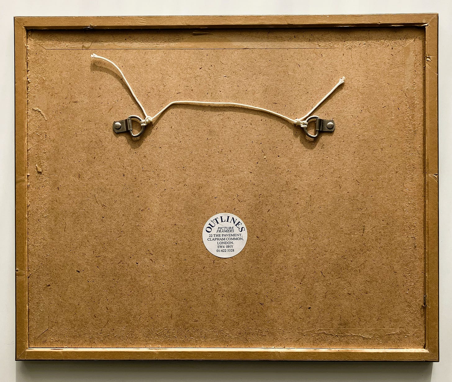 The frame (bought for £13 from Oxfam on Kensington High Street, 25.3.26) was made by Outlines Picture Framers, 22 The Pavement, Clapham Common, London SW4 0HY. 01 6225328. The 01 London code dates it as pre 1990. The framers, also a gallery, was run by the artist Christina Bonnet. The site is now Lina Stores.
