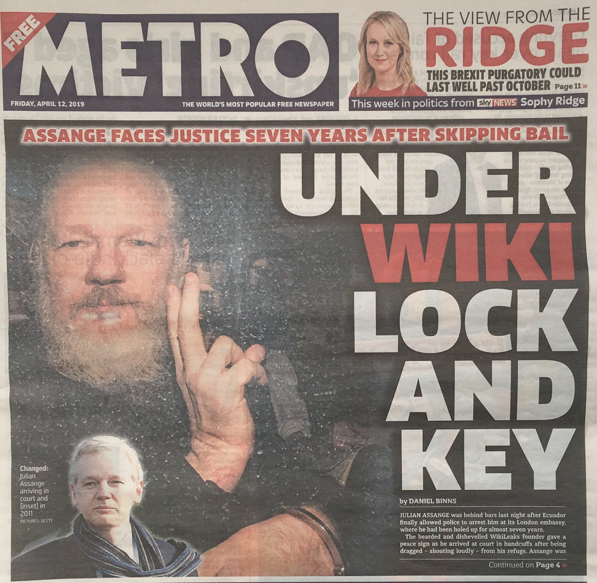 Hand 1: Julian Assange Metro (12.4.19). Article by Daniel Binns. Getty Images*.